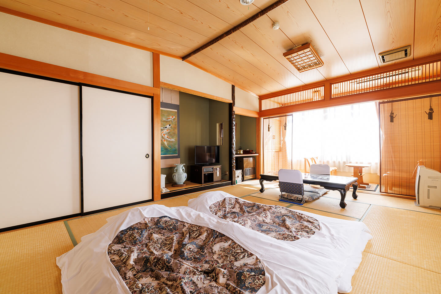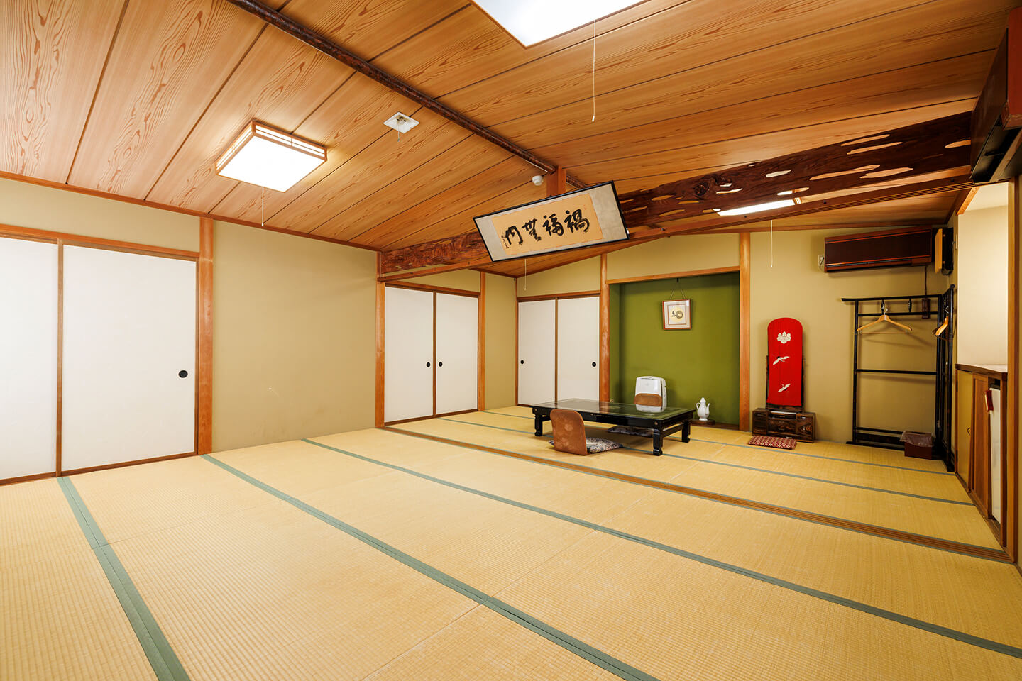 畳敷きの大空間は、世代を問わずくつろげる落ち着いた設えで、ご家族やグループでの滞在に最適。