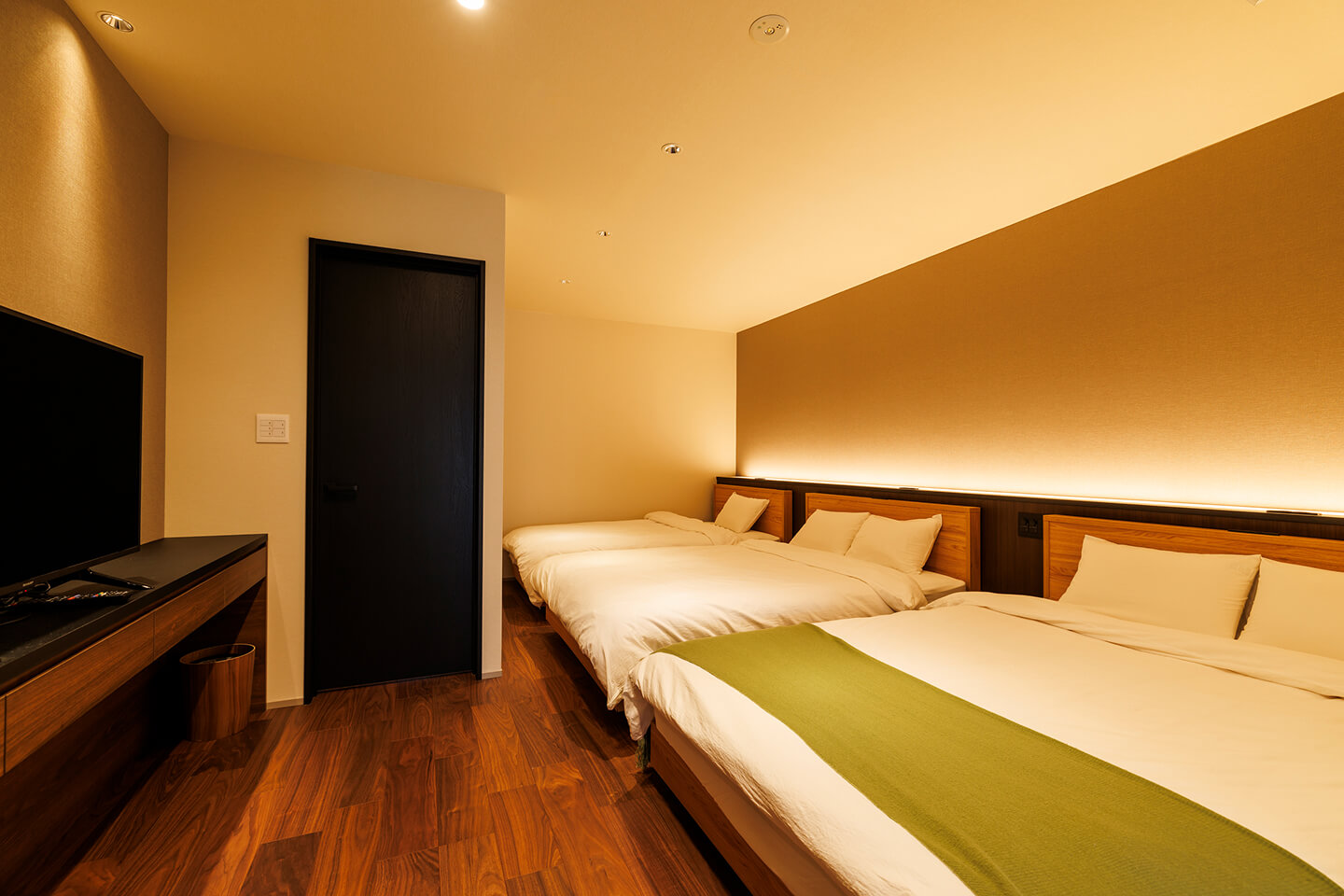 ゆとりある洋室にダブルベッド2台とシングル1台を備えた「菜月」。ご家族やグループでも広々とご利用できます。