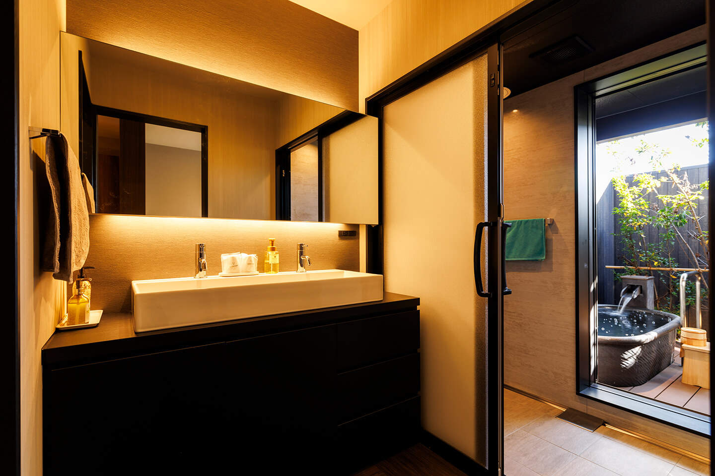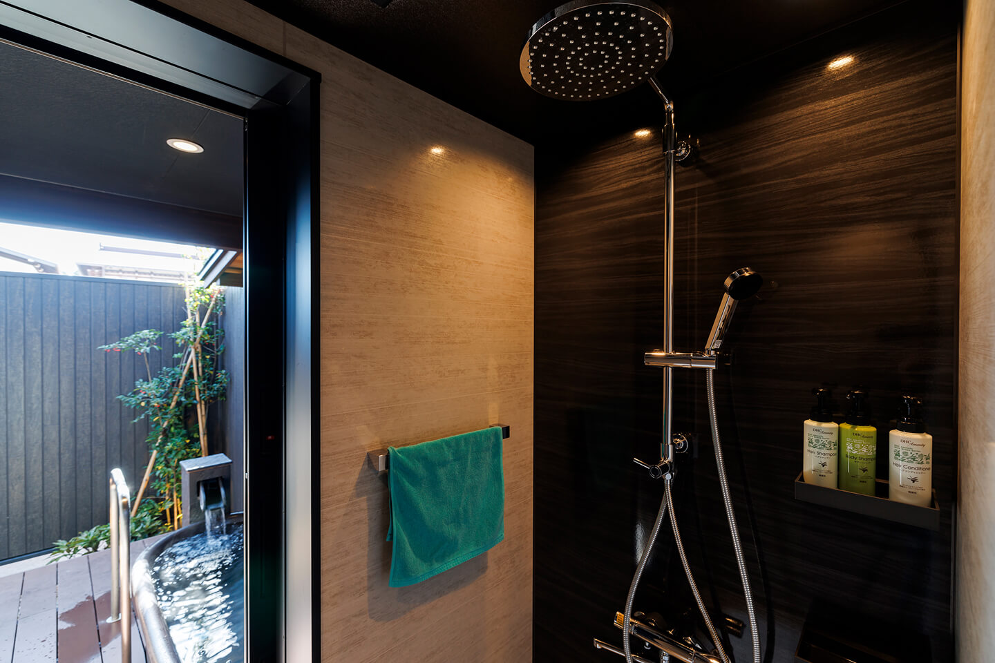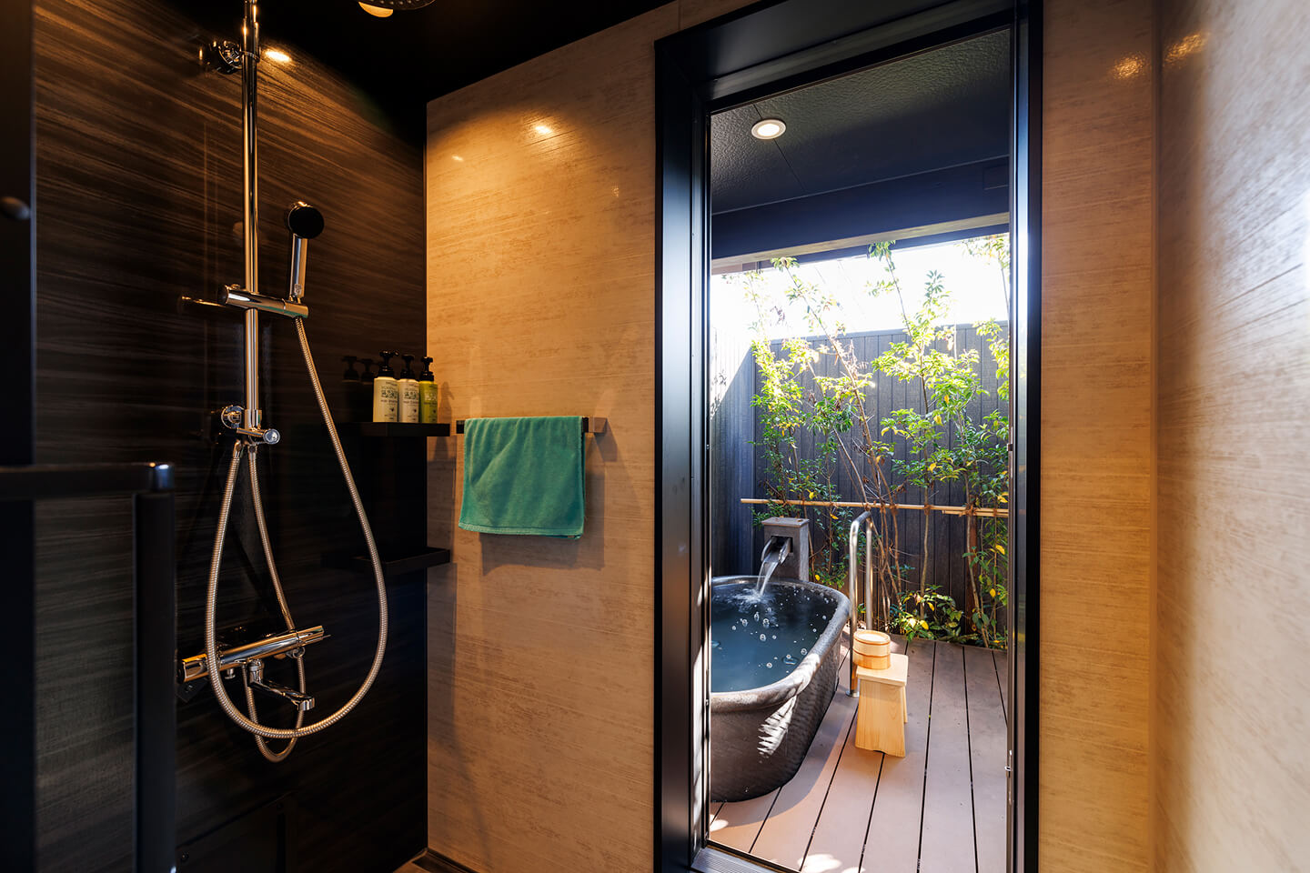 専用露天風呂で気兼ねなく湯浴みを楽しめます。独立洗面化粧台、トイレ別、シャワールーム完備。